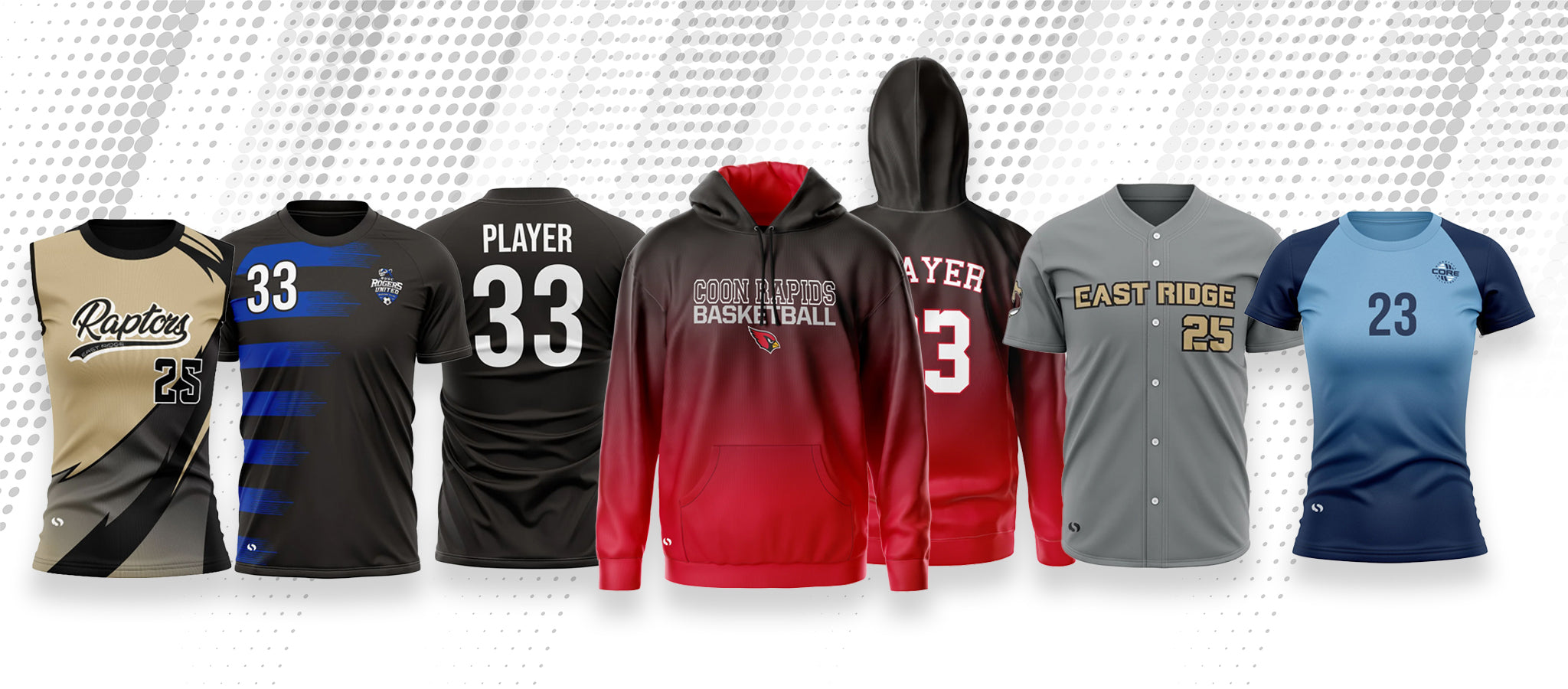 Browse our catalog of sports apparel and merchandise. Click on a sport to see the different designs and styles we offer. Once you find the perfect fit, request a quote and we'll get back to you as soon as possible.